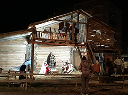 Presepe ambientato in un paesaggio del ‘700 americano. Sono stati realizzati un accampamento indiano e un villaggio western, con edifici in legno e costumi tipici, realizzati interamente a mano, con alcuni effetti e movimenti.